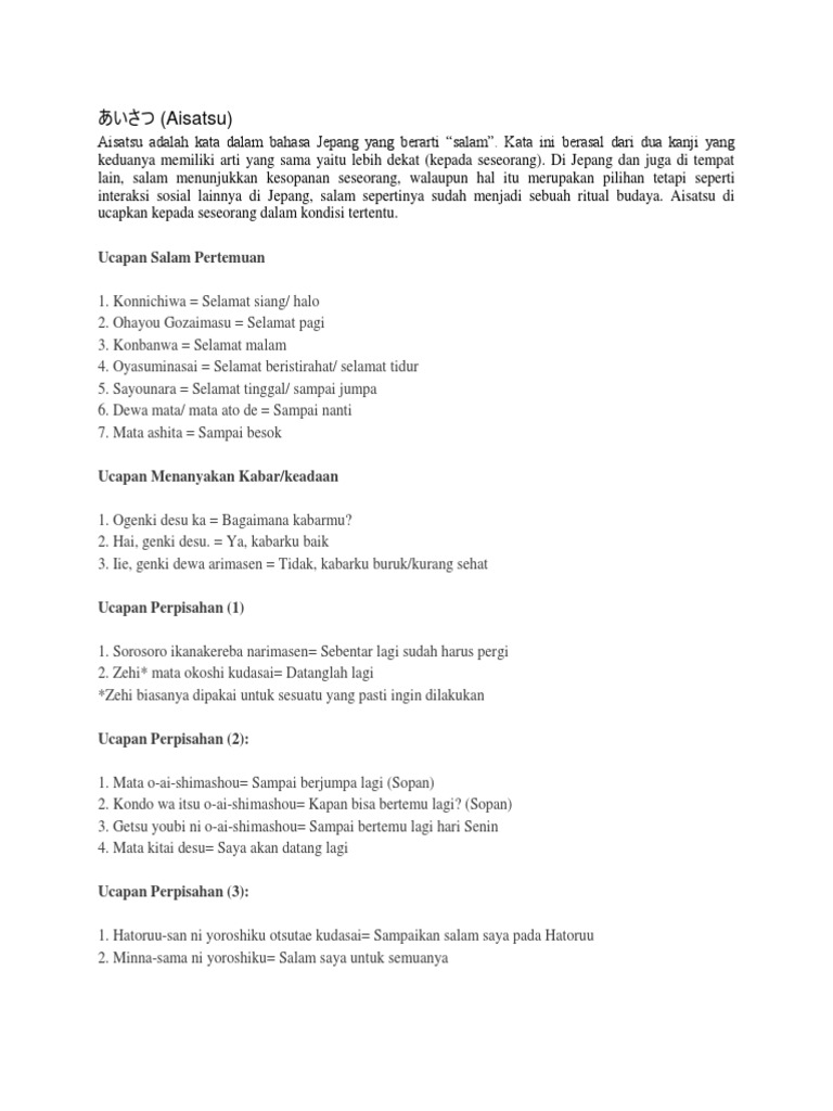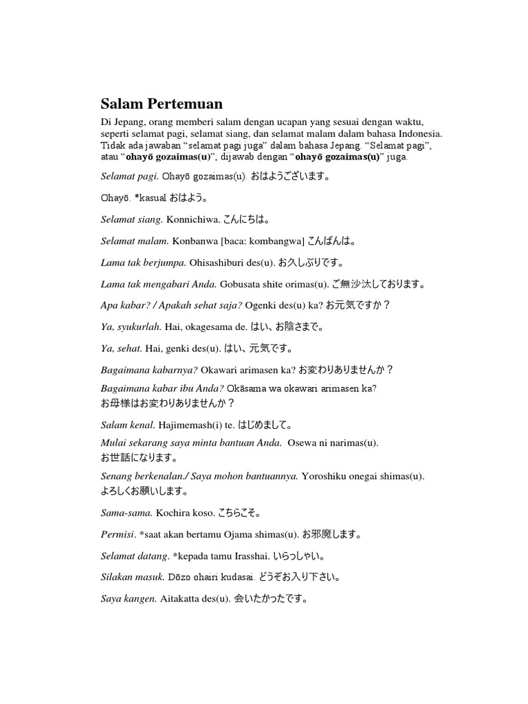 Mungkin yang paling terminal adalah さようなら/sayounara, kan? Berikut contoh ucapan salam & ekspresi: Apa bedanya kuliah sastra jepang dan pendidikan bahasa jepang? Kata ini secara kasar berarti halo dalam bahasa jepang, tapi itu tidak digunakan sesering yang kamu kira. Little notes about my life: