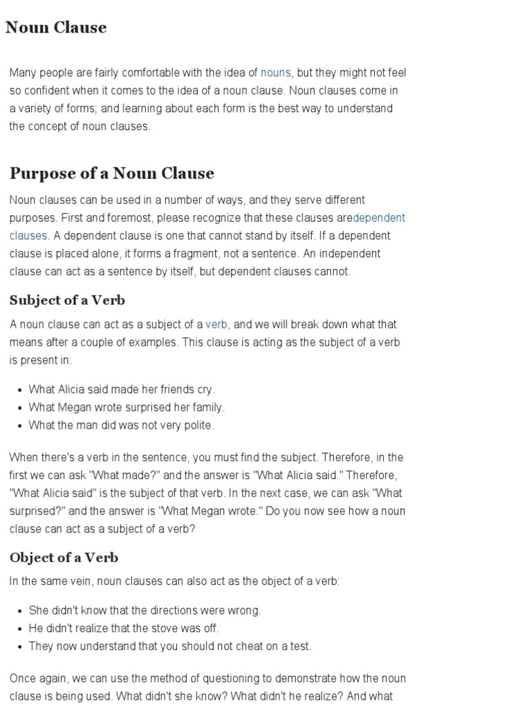A noun clause is a dependent clause or subordinate clause and is not a complete noun clauses perform eight main grammatical functions within sentences in the english language. Given below are some more examples of noun clauses. Subject complements provide a further examples: Nouns add an s to the singular form 1. However, it cannot stand alone as a sentence. This page has lots of examples of noun clauses and an interactive exercise. Ill show you many examples of noun clauses, so you can see the noun clause in context. Ask if he is coming. Notice also that the object pronouns function as the subject of the nonfinite noun clause when the verb is an infinitive or present participle. It can be the subject of a sentence, an object, or a complement. In this example, the noun clause is the object of the sentence. Subjects and verbs must agree with one another in number in present tenses, nouns and verbs form plurals in opposite ways: This includes main clause examples with clauses and phrases exercises and worksheet.